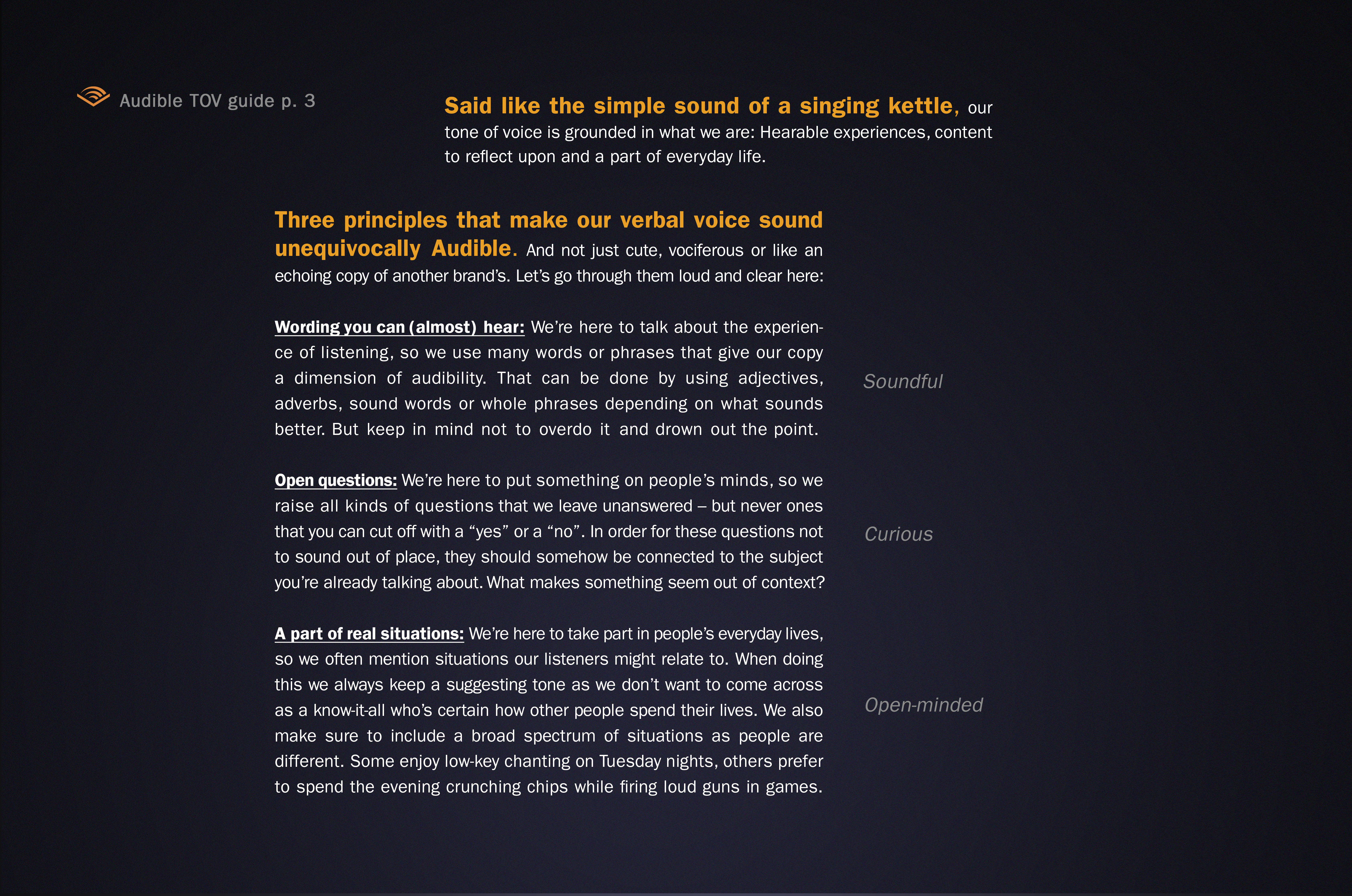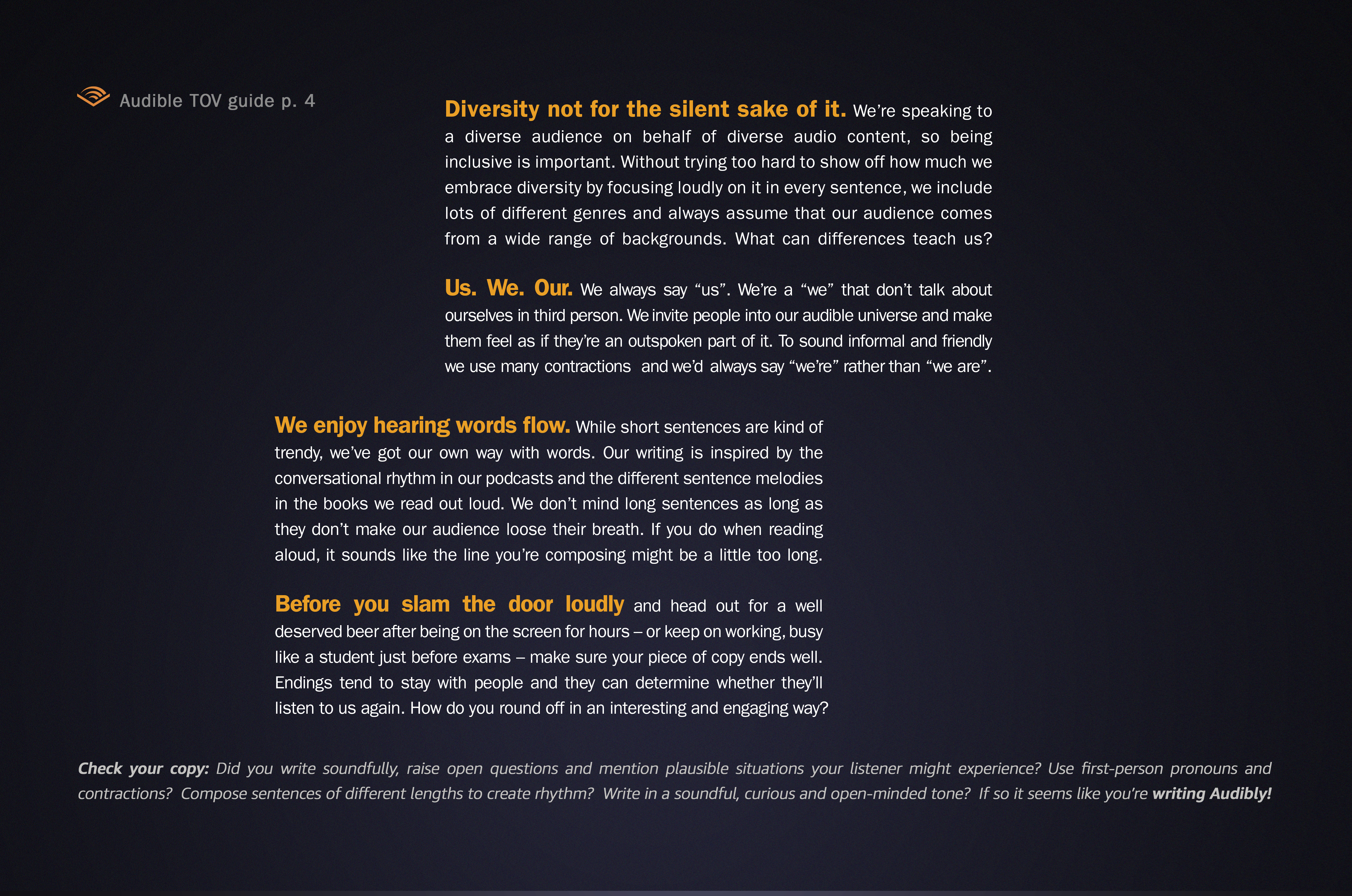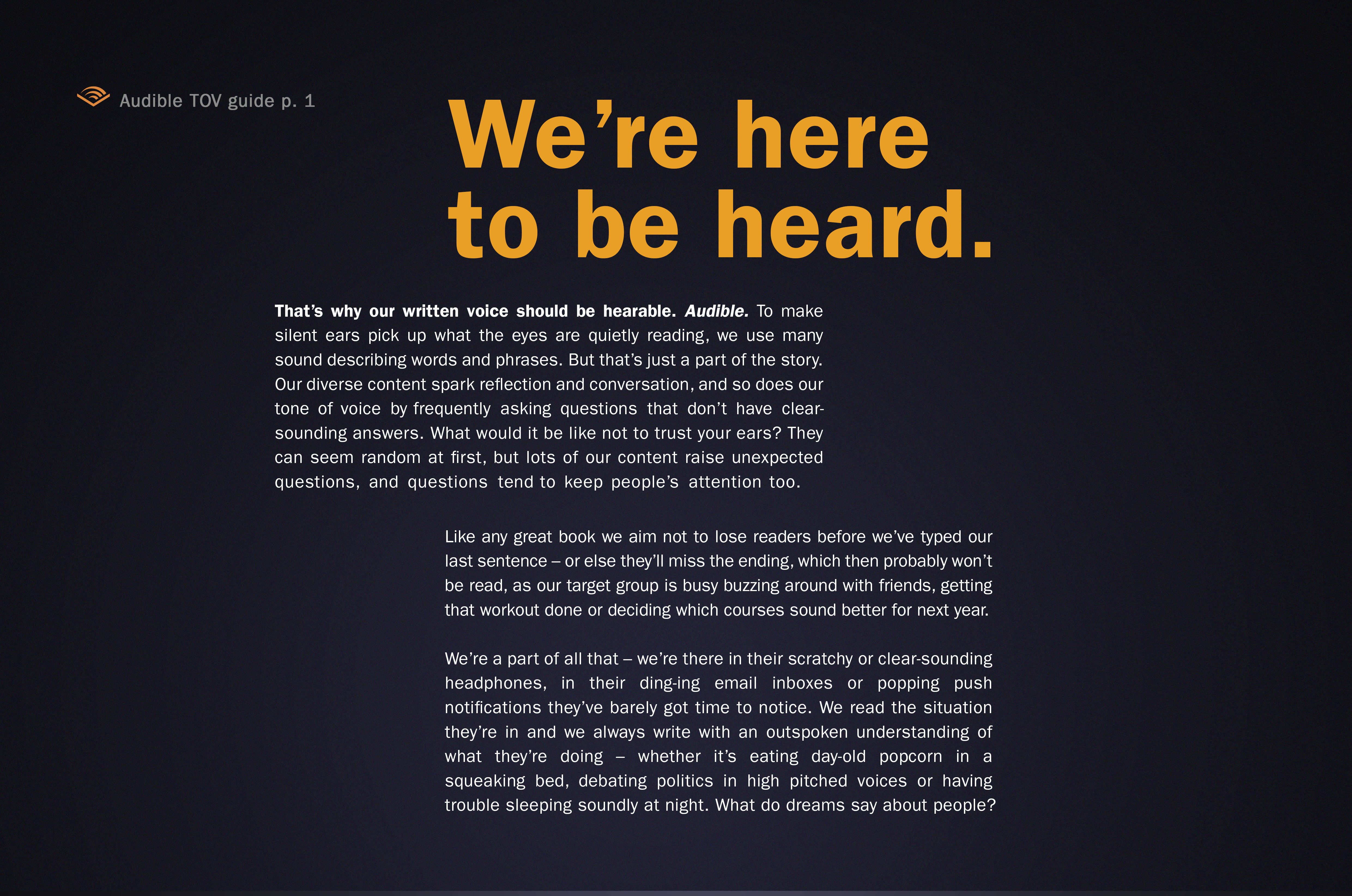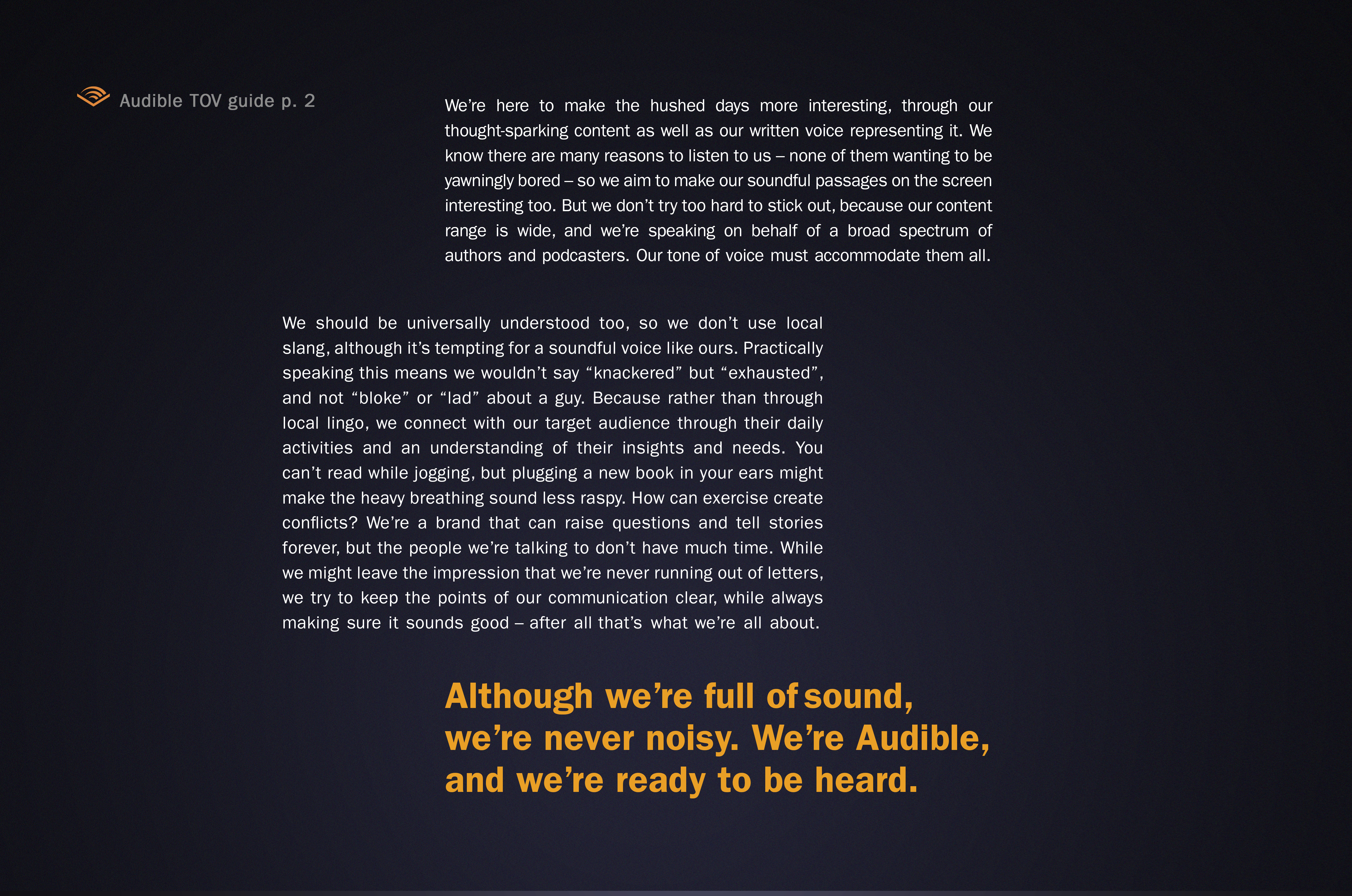 To make Audible’s tone of voice stand out in even the most unexpected places, we've created a set of simple, original principles that can easily be implemented in copy across all platforms. This guide explains how to express Audible’s personality and advertising strengths through any piece of copy, giving Audible a noticeable yet functional way of communicating that appeals to a diverse range of potential Audible consumers.