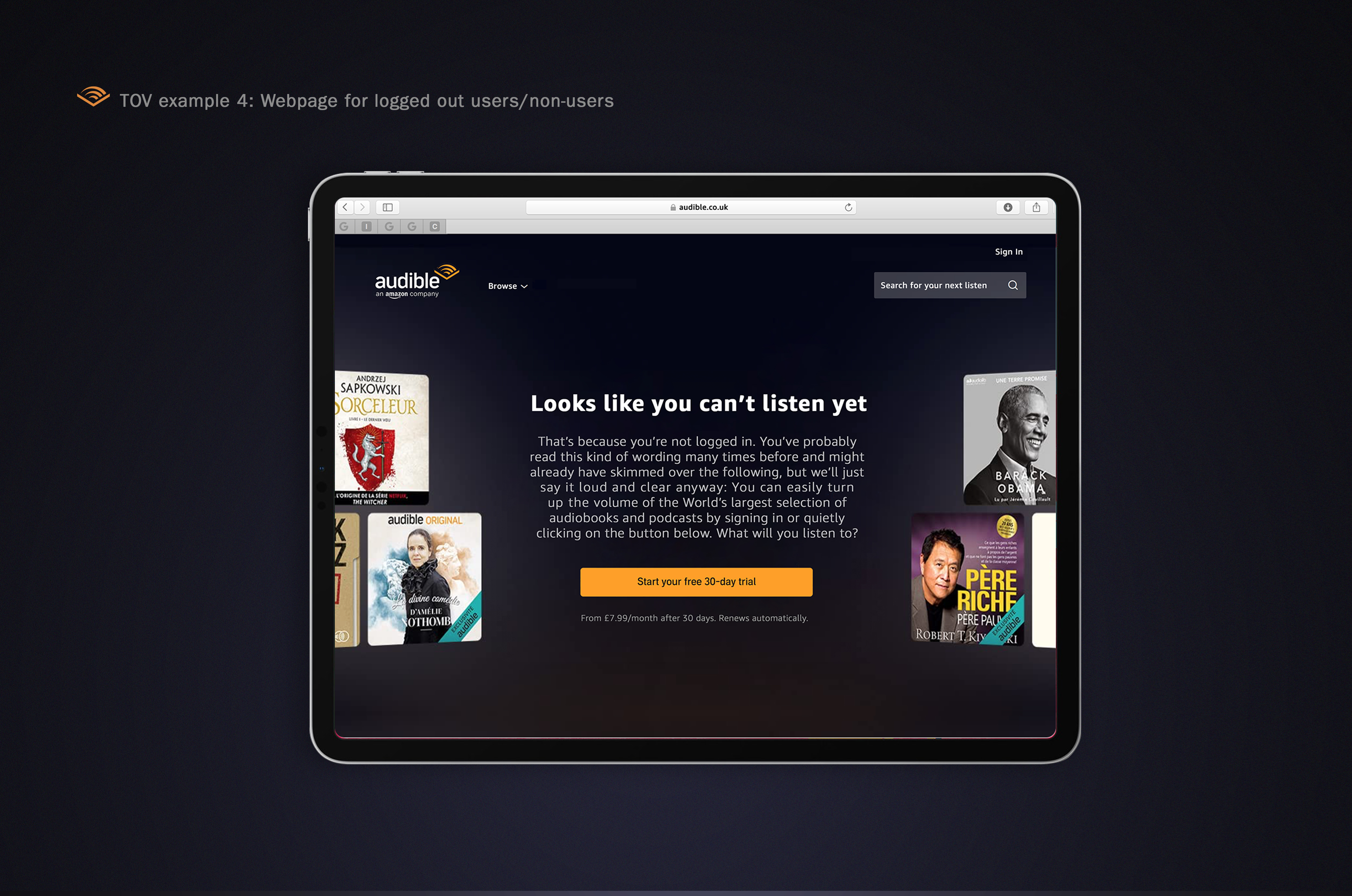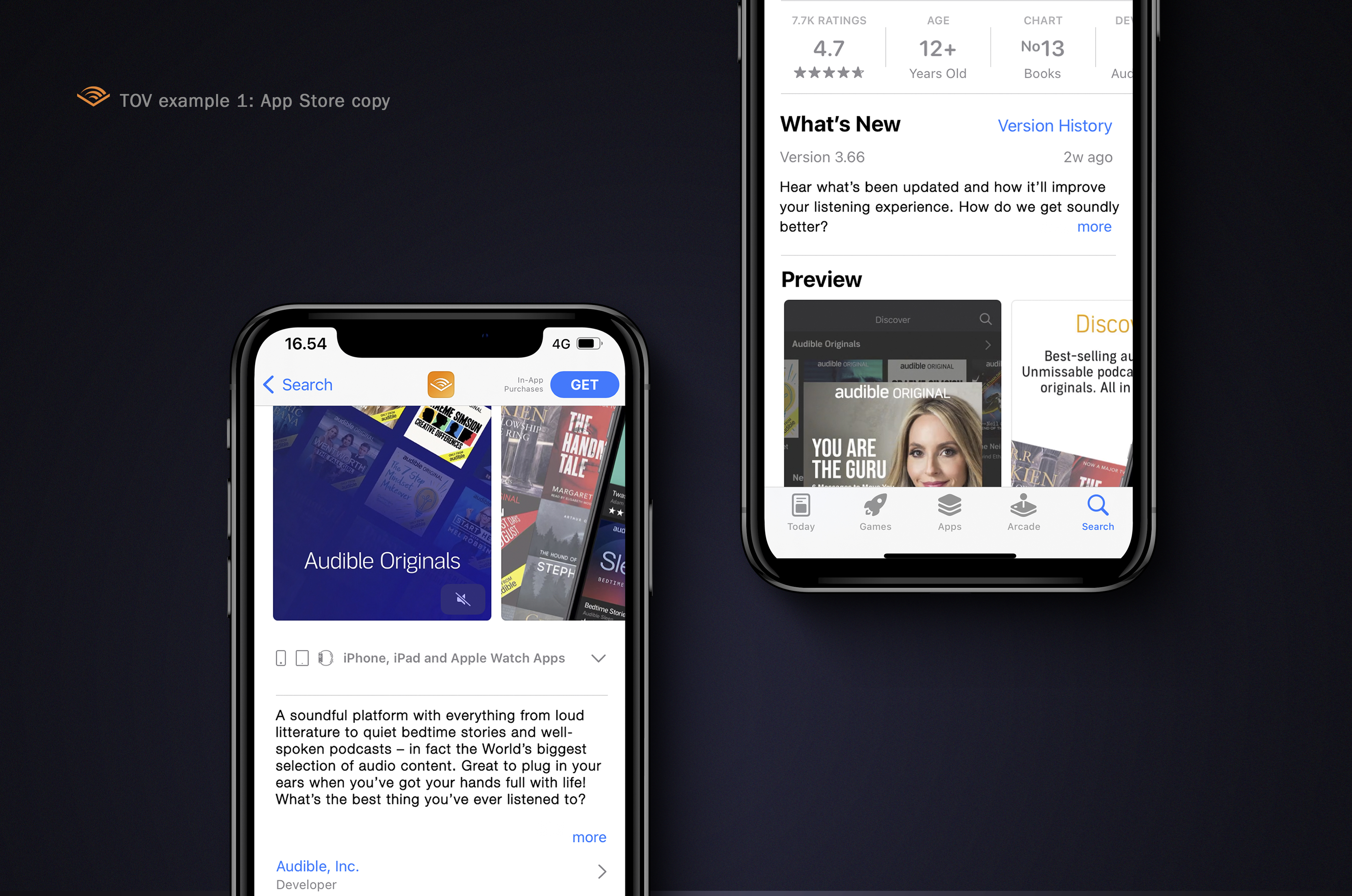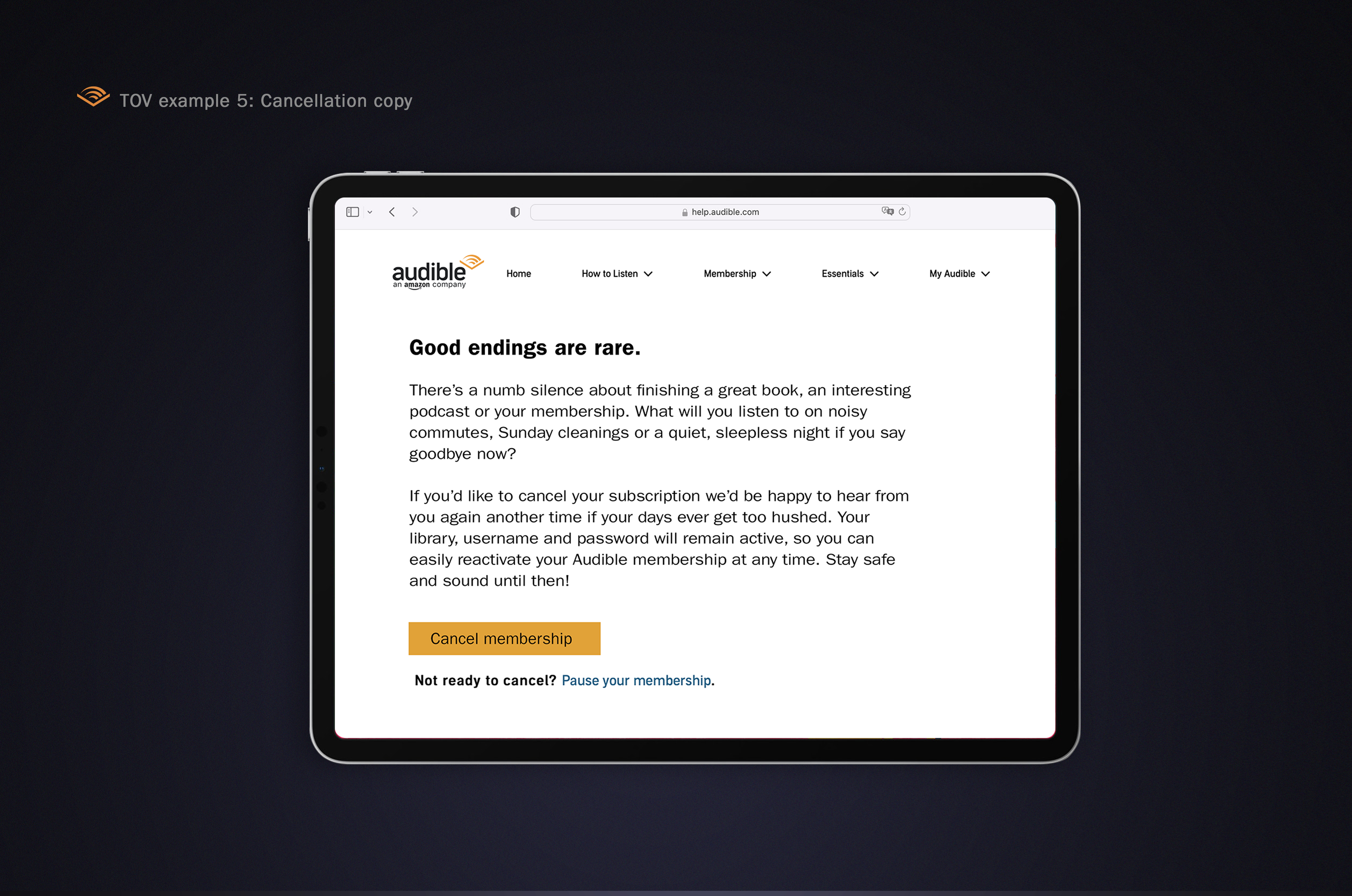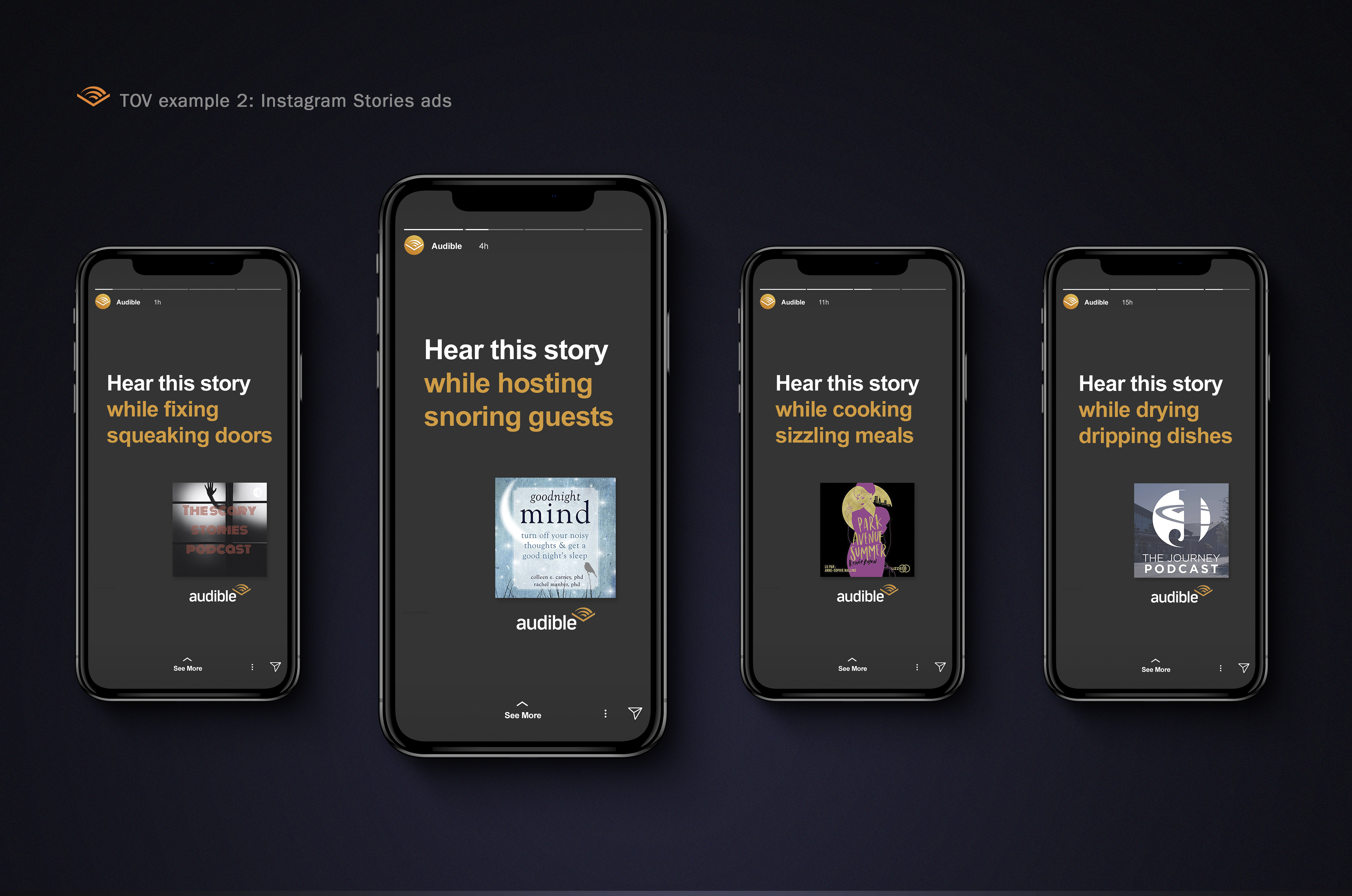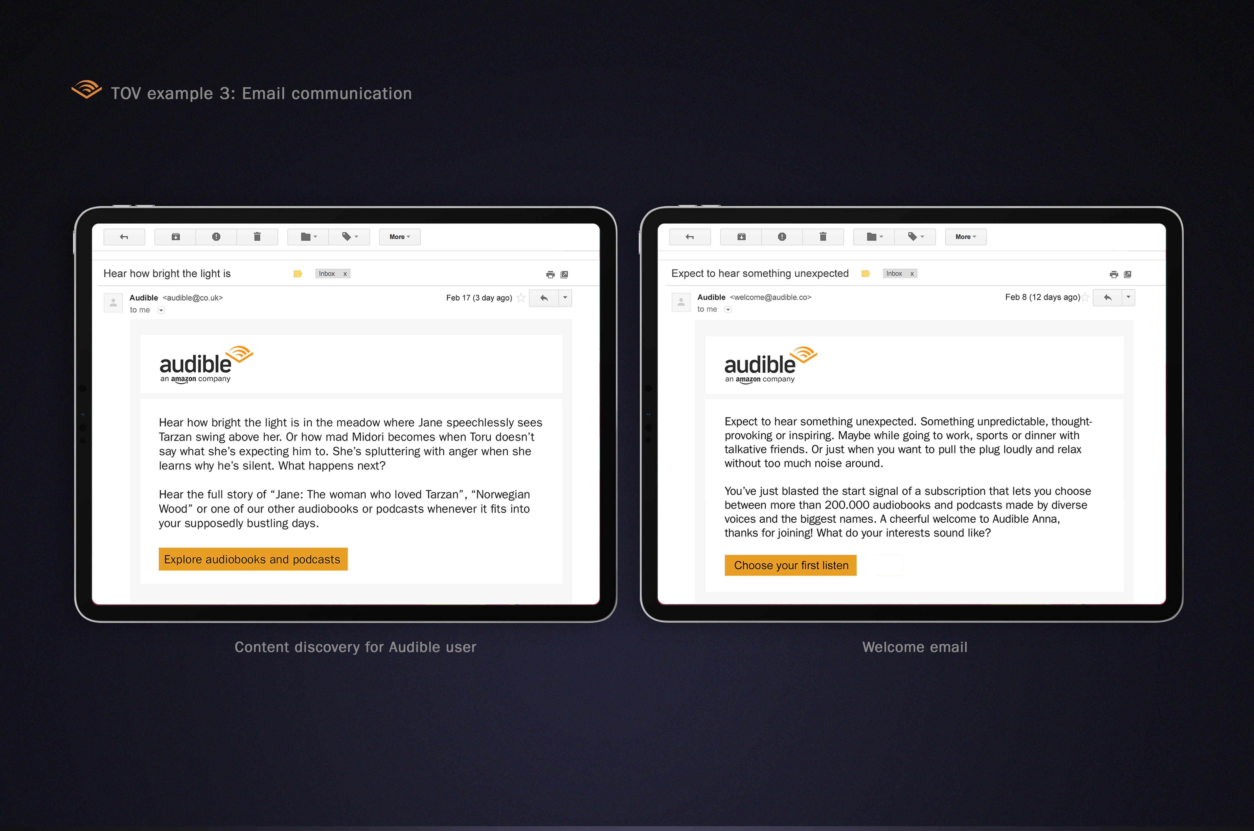 To make Audible’s tone of voice stand out in even the most unexpected places, we've created a set of simple, original principles that can easily be implemented in copy across all platforms. This guide explains how to express Audible’s personality and advertising strengths through any piece of copy, giving Audible a noticeable yet functional way of communicating that appeals to a diverse range of potential Audible consumers.
